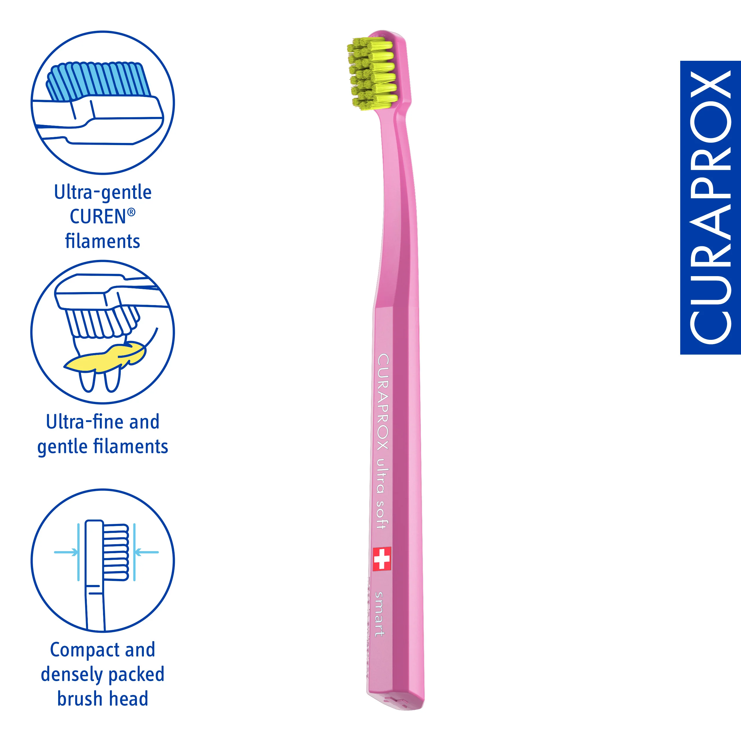 Curaprox CS smart ultra soft is a high-precision toothbrush developed for exceptional plaque control with maximum gentleness. Originally designed for children aged 6 and older, its compact head and extra-fine Curen® filaments make it highly effective for adults with smaller jaws, orthodontic appliances, or high sensitivity. The small head ensures excellent access, even in hard-to-reach areas. With 7,600 Curen® filaments at just 0.08 mm diameter, the CS smart offers an incredibly dense and soft brush head.